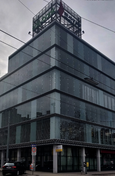 Upon arriving at 51–55 Quellenstraße, I found a large and rather imposing modern glass building. Not wholly looking out of place, this building stands out as much more modern than those surrounding it. The structure—a former bank building—takes up almost the whole block and had a rather lonely feeling to it. Under further inspection, I found that the building is located directly on the number 6 tram line, making it more accessible than I expected.